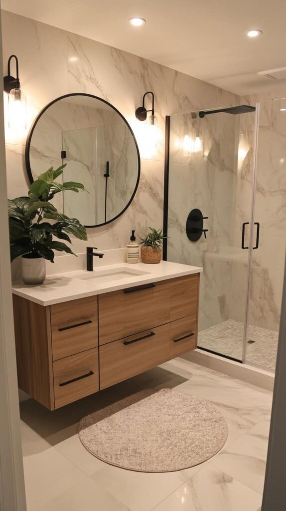 En baños modernos, los espejos con bordes finos o iluminación LED aportan un toque contemporáneo y minimalista. También pueden utilizarse para destacar un rincón especial: un espejo redondo sobre una consola, por ejemplo, suma estilo sin recargar el espacio.